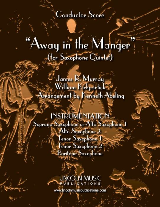 Away in the Manger for Saxophone Quintet. This arrangement incorporates both musical settings of this lovely Christmas Carol by James R. Murray (1887) and William Kirkpartick (1895). It is an intermediate level arrangement with a playing time of approximately 3:10.